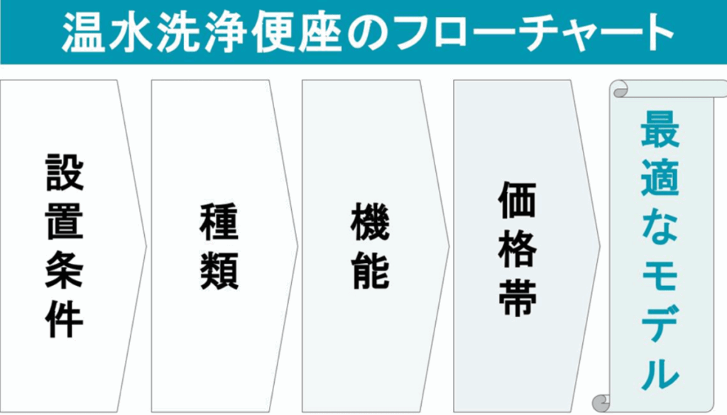 このフローチャートは、温水洗浄便座を選ぶときの基本的な道筋を示しています。