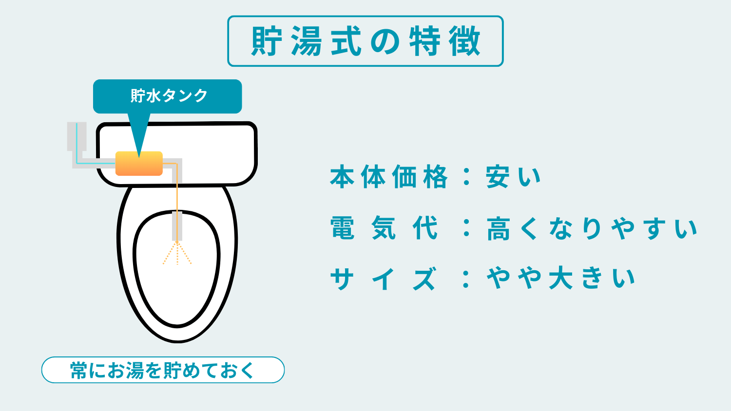 貯湯式は便座内にタンクを備え、あらかじめお湯を貯めておく方式です。