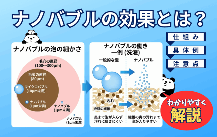 ナノバブルは、そのうえで洗剤や水流が働きやすい状態を作り、洗浄を後押しするものとして捉えると整理しやすいです。