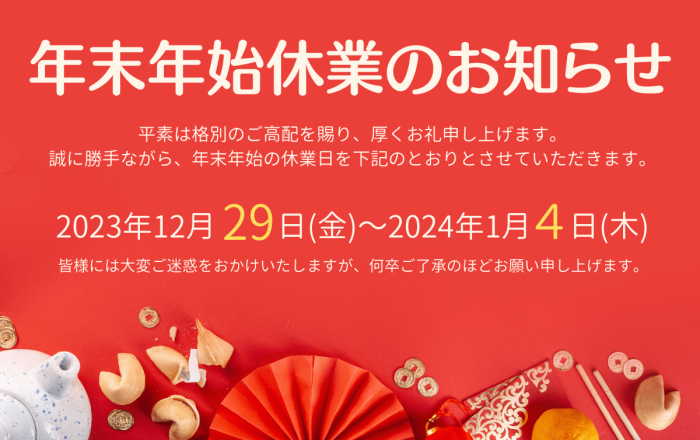 さて年末年始の休業日でございますが、下記のとおりとさせていただきます。皆様には大変ご迷惑をおかけいたしますが、何卒ご了承のほどお願い申し上げます。