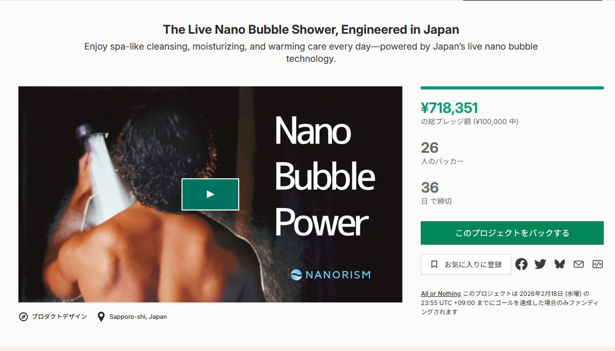 『NANORISMシリーズ』のナノバブルシャワーヘッド・米国向け新モデル “The Live Nano Bubble Shower – Engineered in Japan” を、2026年1月9日より米国クラウドファンディングサイト「Kickstarter」にて公開いたしました。