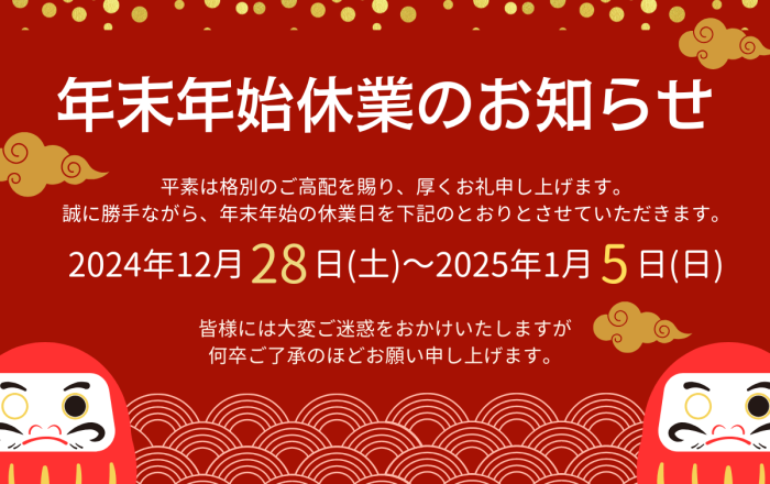 年末年始の休業日のお知らせ 2024.12.16 拝啓 師走の候、ますますご健勝のこととお喜び申し上げます。 平素は格別のご高配を賜り、厚くお礼申し上げます。 誠に勝手ながら、年末年始の休業日を下記のとおりとさせていただきます。 皆様には大変ご迷惑をおかけいたしますが、何卒ご了承のほどお願い申し上げます。 敬具 記 年末年始休業日 2024年12月28日(土)~ 2025年1月5日(日) ※なお、2024年12月27日(金)の営業時間は、誠に勝手ながら正午までとさせて頂きます。 新年のご挨拶 前の記事 新春限定!福袋販売のお知らせ 次の記事