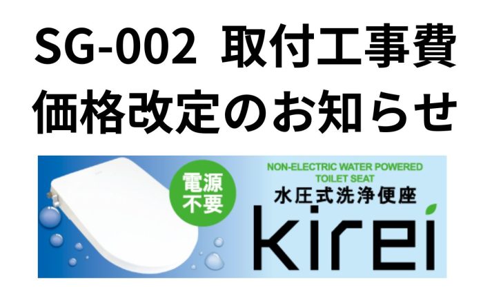 弊社におきましても水圧式洗浄便座『kirei』の全国取付工事のサービス料金につきまして、やむなく価格改定を実施させていただくこととなりました。