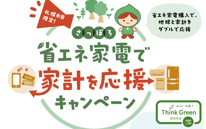 2024年12月現在、札幌市では対象期間内に登録店舗で省エネの特定品目家電を購入すると、キャッシュレスポイントを付与するキャンペーンを実施しているんだよ!