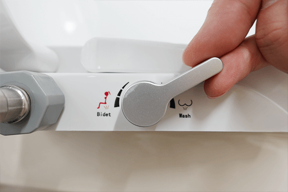 レバーを前に倒すと、空気をたっぷり含んだ水で「おしり」洗浄、後ろに倒すと女性に優しい「ビデ」洗浄。また、ノズルが元に戻る際に自動でノズル洗浄するため、清潔にお使いいただけます。
